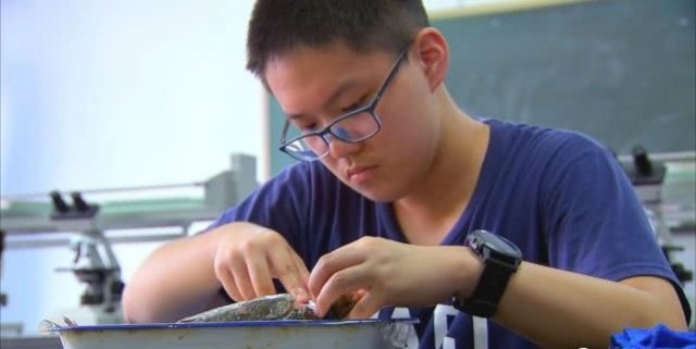 在实验室里,黄奕远正在认真地解剖鲫鱼。